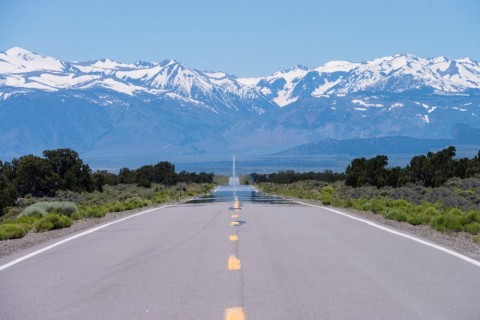遙かなる山々に向かってまっすぐ伸びる道 米