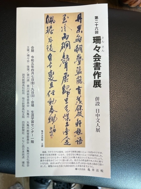 それから県議選の選挙に牟礼北小学校に行ったが我々以外誰もいなかった。投票率が低そうだ。出口調査と言ってNHK関係の人が様子を聞いてきたが、「地元から誰も出ていないので力が入りませんよ」と言っておいた。それからアンデルセンでモーニングを食べて、近くの柴野製菓でいつもの「栗山の郷」を買って丸亀へ。生涯学習センターで開催中の「珊々会展」の観賞に行った。亀井先生ご夫婦で歓待された。先生の王鐸の臨書は特に素晴らしかった。