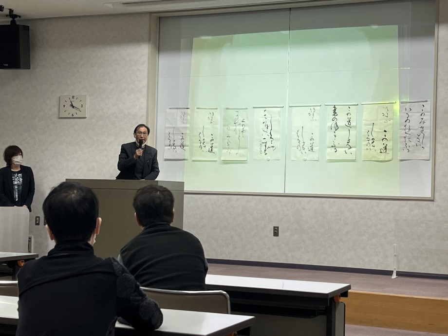 今日は木曜日で、勤労感謝の日。9時半から年二回開催している書道講習会で今回はかなの藤井直子先生による「大字かな」の講習会だった。写真は助講師の廣田蓬邨先生の説明で左奥が講師の藤井先生。かなの紙と筆は会場に販売に来ていた摩巍堂さんに選んでもらって買った。藤井先生は故光宗先生のお弟子さんで日展も入選している有名なかなの若手作家で私は今ほど有名になる前から、香南町には前衛の穴吹先生とかなの藤井先生が活躍されていると存じ上げていた。2時間ほどの講習会で、大字かな独特の作品構成、考え方等勉強になった。会場まで奥に車で送ってもらっていたので迎えに来てもらってイオンモール綾川でお昼を食べて、帰りにレオマの近くのお店で茄子の辛子付けを買った。夕食はレインボー通りにあるマルヨシセンターでポテトサラダにして、ふるさと祭りで買った牟礼村のリンゴをポテトサラダに入れて食べた。リンゴがある無しでは雲泥の差だ。