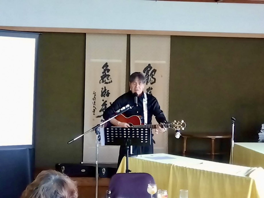 今日は日曜日で、10時から石の民俗資料館友の会の役員会並びに総会に出席した。その後すぐに永和書道会の総会のため会場の神明殿に急いだ。持ち物がたくさんあって下ろして二階の会場まで運ぶのを手伝ってもらった。11時半から総会は始まった。予定通り12時前には無事終わり、懇親会へと… 準備していた作品の映写はあっという間に終わってワンカットの写真が数秒単位で自動で写り変わるので説明の暇がなかった。それでも今回は社中の人が写してくれていたので助かった。その後みなさんには社中展で大変お世話になっているので少しでも感謝の気持ちを込めて拙い私の弾き語りを聞いてもらった。持ち物が多くて最も大切なアンプを忘れて急遽会場にあるワイヤレスマイクを使用したが音が割れて歌に、演奏にならないところを我慢して聞いてもらった。料理も次々に運ばれて来て、お腹いっぱいになった。事務局には事前に何回も今日のために打ち合わせをしてもらい感謝です。おかげさまで今日は参加者の皆様には喜ばれたことと思います。最後に皆さんから思いもよらず立派な花束までいただき、お包みまで添えられて有難くて言葉になりません。いい弟子を持ったもんだ。帰って疲れからか横になったら寝ていた。夕食の後バレーに行った。体を動かすことは気持ちがいいもんだ。