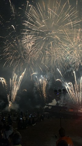 今日は土曜日で、夜の「おいでまい祭り」の準備のため8時に会場の漁港傍の広場に集合した。朝早いと言っても暑い。1時間ほどで汗だくになった。帰ってすぐに汗を落として着替えた。お昼はゆめタウンに行ってカルビ丼を食べて帰ってきた。3時から再び夜の「おいでまい祭り」の最終準備のため出掛けた。朝の準備がよくてほとんどやることはなかったが夕方6時ごろからはお客さんが来だした。今回はコロナ感染拡大防止のため、バザー等は一切無しで、花火前の演出として国分寺の夢幻太鼓の演奏が20分ほどあってから花火ショーが始まった。二年ぶりの花火とあって、始まったころには会場に思った以上に来場者があった。