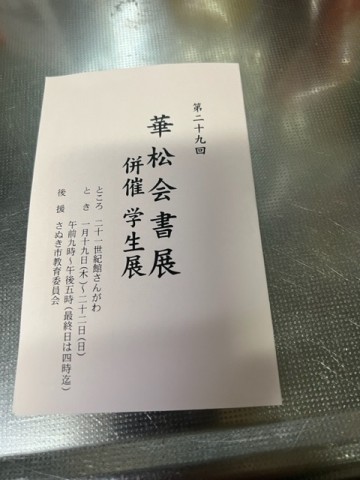 今日は木曜日で、9時半からの教室をしてお昼は牟礼の「王将」へ行ってランチメニューを食べた。その後21世紀館さんがわで開催中の「華松会書展」の観賞に行った。コロナの影響で2年ぶりの開催で第29回を数える。今回は学生展も併催していた。いつも神戸の美味しい珈琲を頂くので、我が町の銘菓?「栗山の郷」を手土産に持参することにしている。岩澤先生もやってきて久しぶりに話せた。私は新聞で目にした石川先生の講座生が観音寺で展覧会を開催しているとの情報に、志度のインターから高速に乗って観音寺まで行った。展覧会は初めてなのか、スタッフは内々らしき人たちで会場内に設えた応接用のソファで大きな声で世間話をしていた。(-_-;)