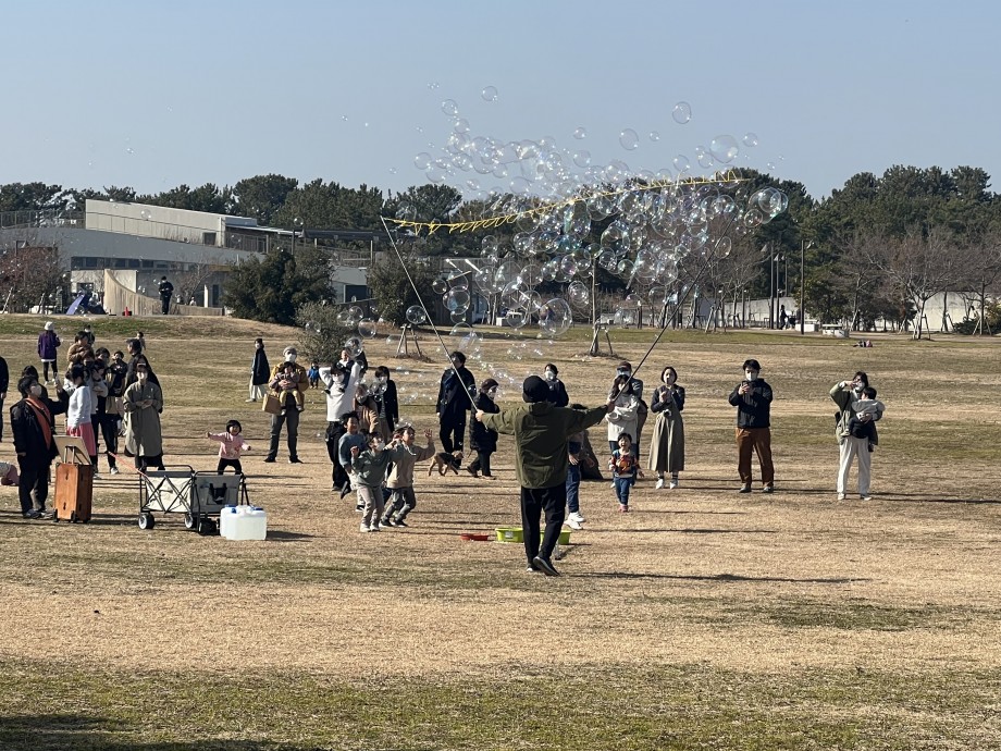 とてもいい天気で、こんなに広い公園で自由に遊ばせられるのは有難い。ちなみに高松市は公園緑地課管轄の公園はすべてペット禁止になっている。公園中央ではシャボン玉パフォーマンスをしていて、大きなシャボン玉やら一度に小さなシャボン玉を見事にこしらえて小さい子らを楽しませていた。