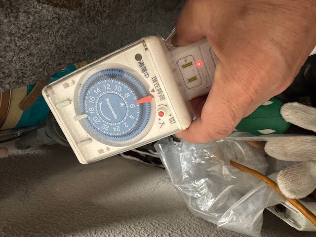 写真は庭の灯りを18時半になったら点灯、明け方6時に消灯できるようにタイマーをセットした。これで毎日自動で明かりの管理ができるので有難い。