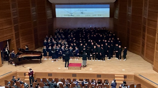 それから今日締切りの「毎日書道学会展」の作品を事務所まで届けた。その後レグザムホールで合唱コンクールに参加の孫のビデオをとるために向かった。昼食をレグザムホールの6階のレストランで食べて小ホールへ。今回は牟礼中学校すべての学年クラスの合唱コンクールとあって大勢の父兄が来ていた。