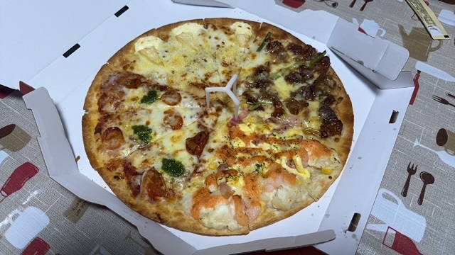 お昼は家でソーメンを食べて昼寝をして、2時からの教室をした。この教室は皆さん忘れず来てくれていた。それからイオンモール高松東店に行ってお茶をして帰りにピザハットに寄って写真のピザLサイズを持ち帰った。半額は有難い。これからぷうちゃんたちとお散歩だ。