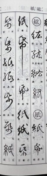 「紙」という文字を藤原鶴来の「書道辞典」で調べると「帋」というのもある。なかなか読めないが「紙」という文字の異体字として古人が使っている。8月の「眞龍」の規定課題の五文字のうちの一字に会長先生が書かれている。