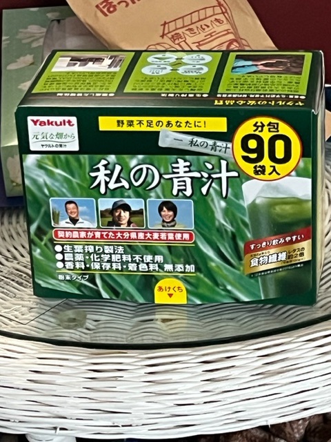 写真はバレンタインデーに、「チョコレートは他にも貰うだろうから」と体に良さそうな「私の青汁」をくれた。