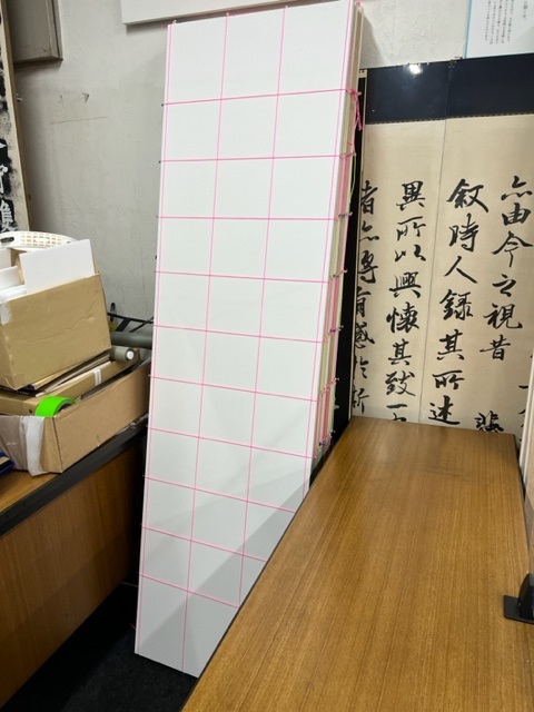 散髪に行って、お昼は久しぶりにびっくりドンキーへ行った。新学期が始まり給食が無いのか子供連れの人が多かった。社中展に出品する10連のパネルに先に堀さんに表具をしてもらって曹全碑の臨書を書く事にした。下準備として写真のようにパネルのサイドに押しピンを刺し、糸を張って四角を作り、その中に一文字ずつ書いていくこととなる。一つのパネルに27文字書けるので、10枚のパネルだから270文字。落款を入れることを差し引いたら、267文字ほどになるだろうか。