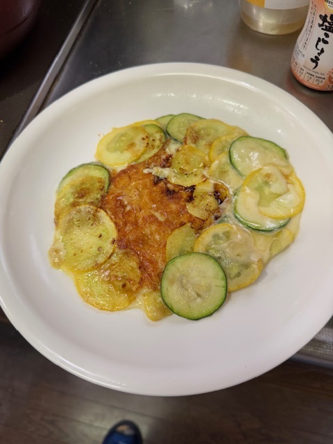 今日は金曜日で、アヴィーちゃんを連れて峰山公園に行った。それからお昼を食べて夕食(ご近所の方から頂いたズッキーニ)を使って写真のズッキーニガレットを作った。