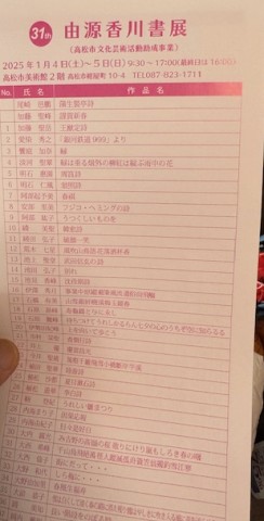 今日は日曜日で、OFF日。久しぶりに徳島に向かった。鳴門あたりを走っていたらMさんからラインが… 車を停めて確認したら「由源香川書展に来ていて10時から待っていますが…」げっ! なんと昨日の書初め展の進行に力果たして、すっかり忘れていました。しかもこの展覧会は日程の都合で昨日と今日の2日間だけしか開催しない。どうしてもパスするわけにはいかないのですぐに高速インターから高松道に入って急遽高松市美術館を目指した。11時過ぎに到着。やれやれだ。展覧会のご案内で今日の10時着としてあったので社中の熱心な人たちは会場でお待ちいただいたようで、本当に失礼しました。(-_-)
