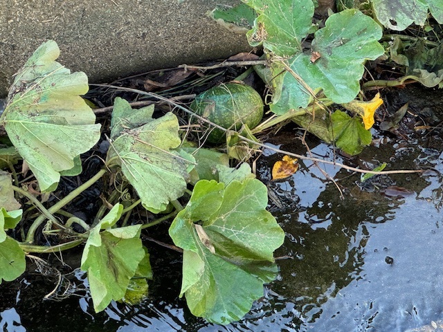 写真はコトデン八栗駅そばに流れる井手(いで)に立派な実を付けた「おろこばえ」のかぼちゃ。誰かが種を無造作に放ったんだろう~