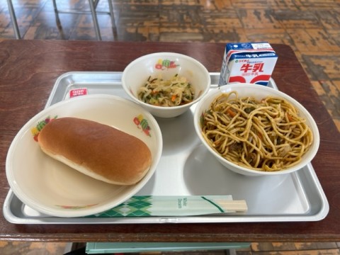 写真の学校給食だが、コッペパン、焼きそば、煮野菜、鉄分の含まれたチーズ、牛乳といったメニューで焼きそばは急いで給仕して食べないとパサパサで…(-_-;)