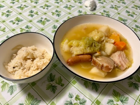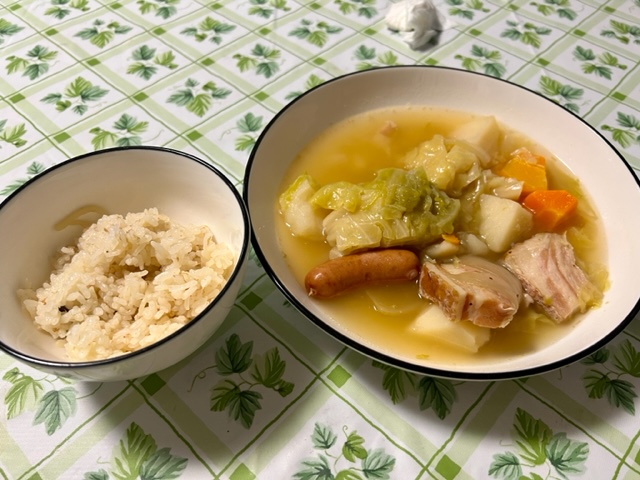 今日は月曜日で、可燃ごみを捨てて朝食を食べた。トースターがいい仕事をしてくれる。それから締切りが近い「眞龍」の競書を郵便局からゆうパックで発送した。月曜日の午前中の郵便局はいつも混雑する。その後ゆめタウンに行って昼食はペッパーランチで食べて、夕食の食材を買って帰った。今宵は写真のポトフとかにの炊き込みご飯にした。4時半からの児童の教室をして、夕食の後夜の教室だ。「書写書道」の競書も明日には発送したいものだ。