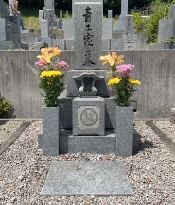 今日は火曜日で、9時半からの教室は夏休み等の人もあってか誰も来なかった。その後ふと気づいたら確か師匠の命日が7月30日だったことを思いだし、慌てて墓参に行った。この墓は私の父が師匠から依頼を受けて師匠のご長男が無くなられた際に建立したもので、文字も師匠が丹精込めて書かれたものだ。金冬心風な格調の高い書は今見ても飽きない。「青」と「木」の文字の大きさの違い。それでいて「家」は「青」の大きさに戻し、「之」は「木」に大きさを揃え、「墓」で纏めに入っている。漢文の「起承転結」に相通ずる書き方で回りの墓文字を圧倒している。お花を添えたらまた雰囲気が変わっていいもんだ。遅れたことを詫び、手を合わせて墓地を後にした。