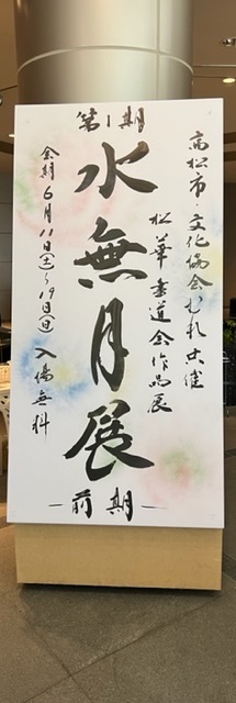写真は文化協会むれ主催の「高松市石の民俗資料館」で開催中の水無月展前期の看板。塩田先生ご社中の書道展となっています。