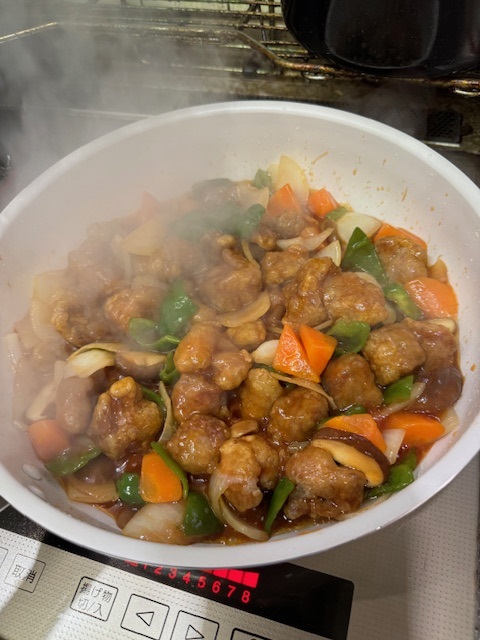 家に帰って郵便局へ行って、「書写書道」と「眞龍」の清書を発送した。社中展期間中だとバタバタして忘れそうなのでちゃっちゃと済ませた。夕食は写真の酢豚を作った。カレーよりは数段美味しいと私は思う。