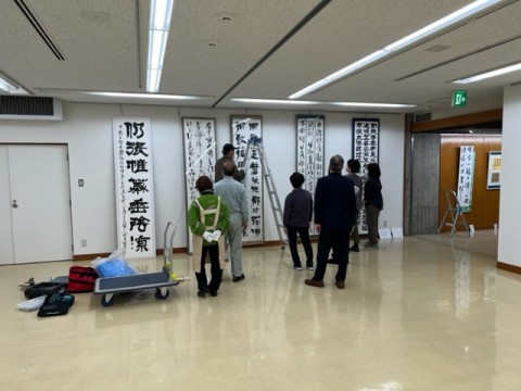 今日は水曜日で、雨が降りそうな中なんと無事降られずに搬入が出来た。各教室の理事さんと男性会員さんの参加により予定の9時半から作品を展示した。以前からすると随分作品数が少なくなって寂しい感じもするが、その分ゆったりと展示が出来た。社中展ならではのレベルのいろんな作品作風があってこれもいいかと思うことにした。