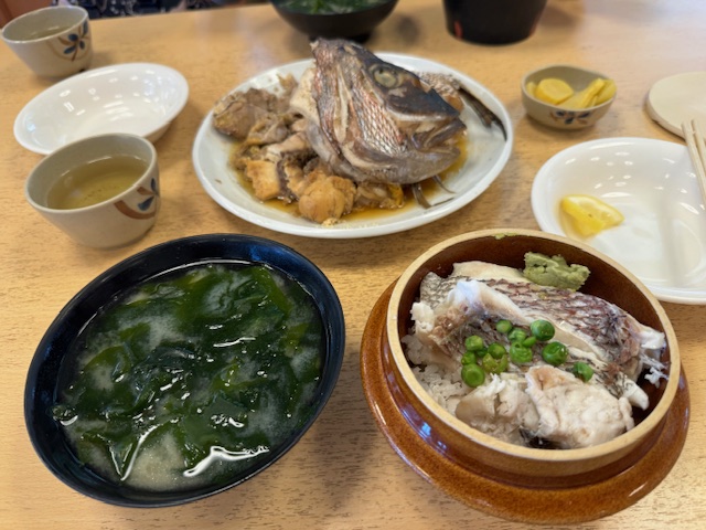 写真は昨日お昼に食べた、私が注文した鯛めしと奥が注文した鯛のあら炊き。
