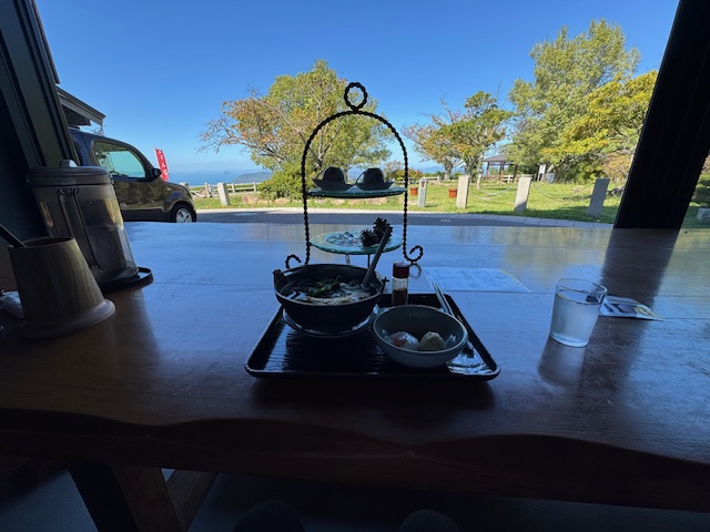 今日は8時に白羽甚社に集合が掛かっていて、明日からの秋季例大祭のための社殿の清掃に出掛けた。自治会で班ごとに役割を充てられていて、私は屋根周りのすす払いを竹を使って実施した。2時間ほどで与えられた作業は終わって帰宅した。それからアヴィーちゃんを連れて屋島山上に連れて行って散歩させた。お昼は桃太郎館に寄って、写真の鍋焼きうどんを食べた。帰りにマルヨシセンターで夕食(八宝菜)の食材を買った。3時ごろ屋島の異人館でお茶をした。5時に牟礼コミセンのロビーで児童の野菜の作品展(書写と絵)の展示をした。6時から青パトに乗って町内を巡視した。夕食の後、夜の教室をした。