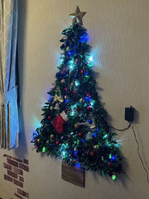 (写真のツリーですが、ネットに出ていたのを参考にしたのだが、まず三角に両面テープを張っておいて、イルミネーションをそこに貼り付ける。それから100均で買ったクリスマス用のレイを4つ張り込み、個別に好きな飾りを押しピンで落ちないよう貼り付けて終了。いざ点灯すると感動ものですよ~)