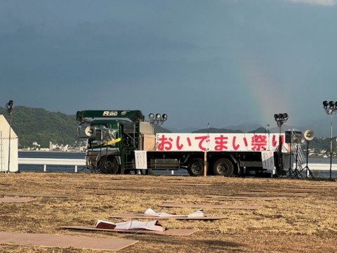 先日の「おいでまい祭り」のトラックの荷台を使用しての簡易ステージ。後ろにたまたま虹が出ました。