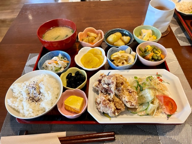 お昼は初めてのお店でランチメニューを食べた。人気のお店のようでほぼ満席だった。品々あって量が多目だった。