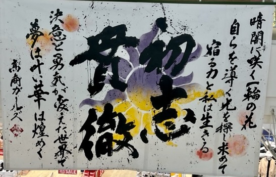 今日は金曜日で、10時半ごろにイオン高松店に行った。写真の「書道パフォーマンス」での作品が展されていたので後輩の高商の書道ガールの作品を写メさせてもらった。他の学校の作品とならかなりの完成度で圧倒していた。特に作品を立てらせる際に墨が流れるであろう箇所が少ないのは見ていて気持ちがいい。経験からくることなのだろうが、バックの彩色もこれなら作品に対して違和感がない。ただスプレーを無駄に吹き付けるだけのパターンは一考を要すると思う。最後の落款部分「高商ガールズ」はなんとか完成度を上げて欲しいものだ。