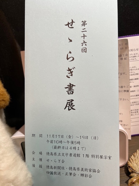 今日は散髪の後、徳島文学書道館で開催が始まった「せゝらぎ書展」を観賞した。黒田先生主管の「正筆会」の言わば徳島支部とでもいえるであろうかなの書展で格調が高かった。昨年に観せてもらった際に受付で名前を促されて書いたが、今回ご丁寧に案内状が届いた。正筆会と言えば、古くは神戸の安藤聖空(梅雪)先生が起こし、香川では香川竹甫先生が大西先生、光宗先生、廣瀬先生と三人のかなの大家を育て大いに発展した経緯がある。県外なのに私にまで案内が届くということは珍しい。香川でも青澄会が正筆会傘下で立派な作品を発表しているが、今回の徳島のかなは変体仮名も基本に忠実で読み易かったという印象だった。隣の部屋では尾崎邑鵬先生グループの「由源」作品展をしていたが、私は香川の加藤先生ご社中の作品展が好きだ。帰りは鳴門を過ぎた辺りから雨が降り出して夕食の食材をどこで買おうかと雨の弱まるのを待って志度まで帰った頃小降りになったのでフジで買うことにした。今宵は焼き肉にした。