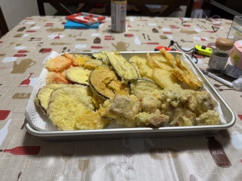 写真は奥が作ってくれた野菜天ぷら。私が天ぷらをしたら黒くなって見てくれも悪いが、理由を聞いたら温度がどうも高すぎるためのようだ。レシピにはどれも160℃から170℃程度でと書いてはあるが…
