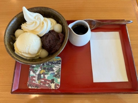 「もえぎの里」から持ってきてくれるパンをいつも買って帰って、家でお昼に頂いています。お昼を食べた後ラムーに寄ってコーヒー牛乳を買って、夕食の食材(冷凍うなぎ)を買って近くの「かまど」に寄って、写真の「珈琲ぜんざい」なるものを注文。シロップを入れるような器には暖かい珈琲が入っていてそれを写真の緑の器に掛けて食べるとのことだった。初めての経験で小豆はやはり美味しい~ ^-^