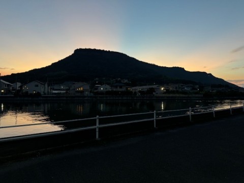 今日は金曜日で、3週目OFF日。写真は日没後にぷうちゃんたちを連れてのあいびき川沿いの散歩コースから見えた屋島の夕景。牟礼側を川沿いに歩いて「たかばし」を屋島側に渡ってあいびき川を横目に古高松方面に歩いて、電車沿いに戻って来るコースがお気に入りだ。