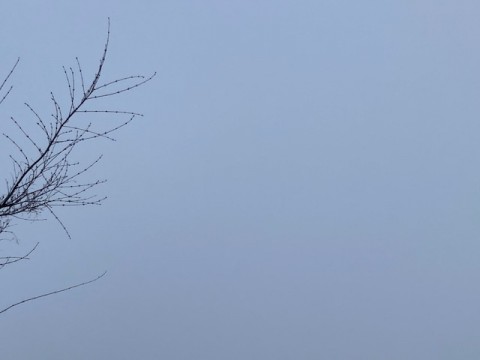 今朝は灰色の雲が広がり、靄が立ち込めて辺りが白くなっています。