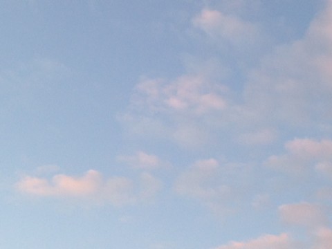 今朝は青空にところどころ雲が浮かんでいます。朝日に照らされて明るい空です。