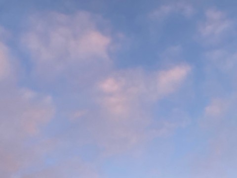 今朝は小さな雲がまばらに浮かんで、雲の間から朝日が射してきています。