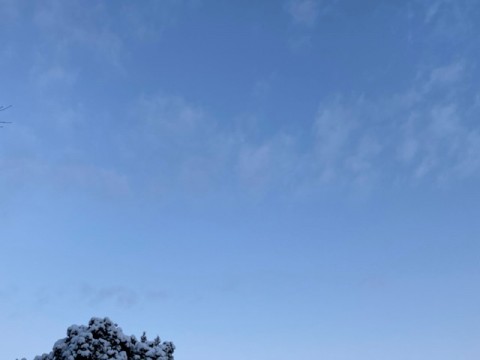 今朝は広く青空が見えて空が明るくなってきています。夜の間に雪が降り、3cmほど雪が積もってまた雪景色になっています。