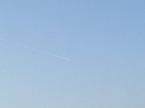 今朝は青空が広がって、明るい陽が差し込んでいます。飛行機が飛んで、ひとすじの雲が伸びています。