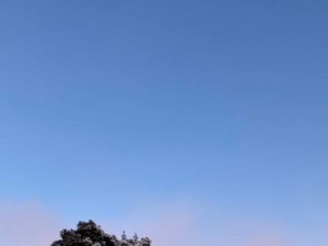 今朝は広く青空が見えて明るくなってきています。夜の間に雪が降って1cmほど積もって、辺りが白くなっています。