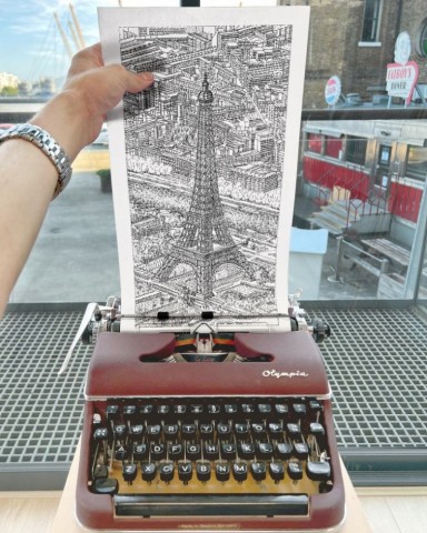 さんが、古い年代物のタイプライターを使用して文字と記号だけで絵を描いた作品です。文字と記号の印字により巧みに濃淡を表現し、街並みの風景や人物画、有名な絵画を再現したものなど、タイプライターで様々な絵を描き続けています。