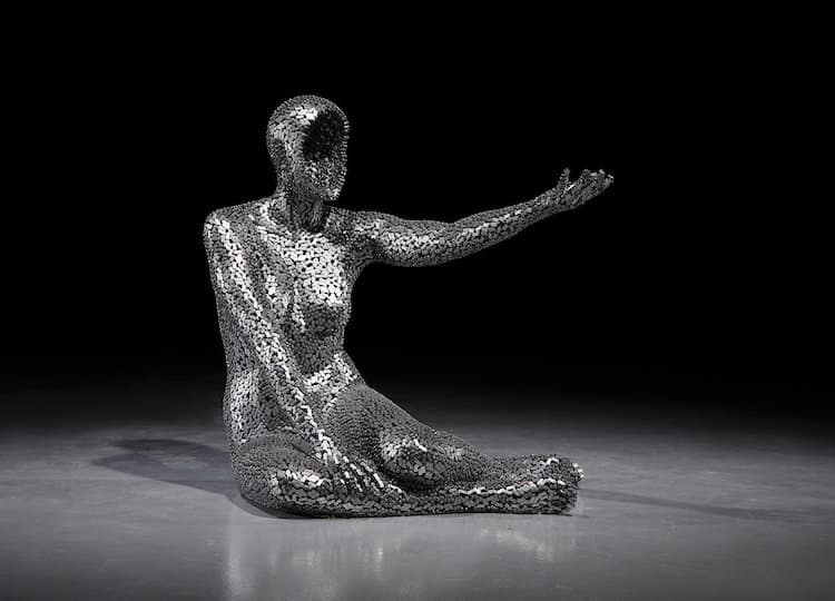 さんが、自転車チェーンや鎖で作った人物の彫刻です。数百の金属のリンクをパズルのように組み合わせて、豊かな姿勢の滑らかな人物の像を作っています。