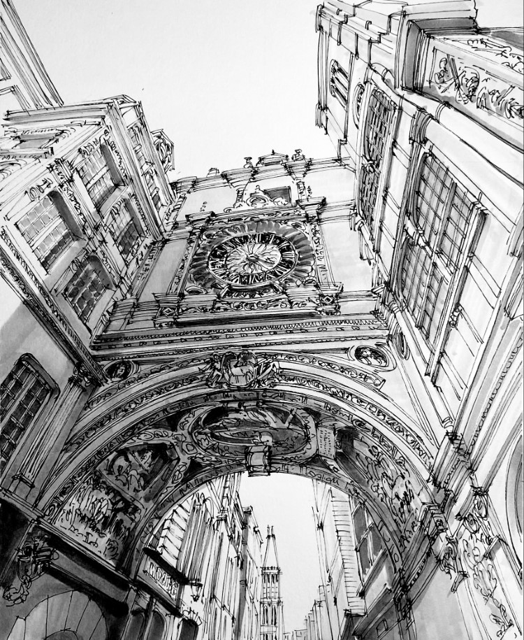 さんが描くパリの歴史的建築のスケッチです。サンテティエンヌ・デュモン教会のゴシック建築の外観や、パンテオンの内部など複雑な造形の建築物を、鉛筆で下絵を描き、インクで仕上げて、美しい建築スケッチを描き上げています。