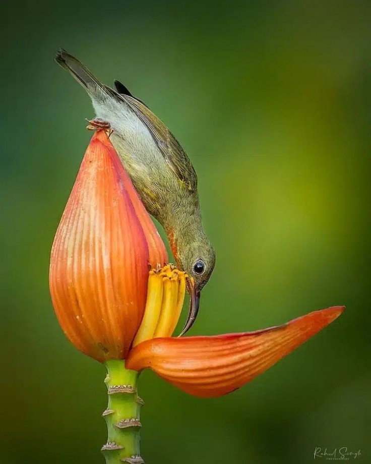 バナナの花びらの水たまりで水浴びする野鳥の写真 / Rahul Singh