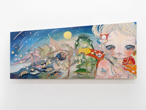 how deep how far we can go(どこまで深く、どこまで行けるか)」です。村上隆を師事し、村上隆率いるKaikai Kikiに所属。鎌倉のアトリエで豊かな自然に囲まれながら、自然や祖先とのつながりを感じる暮らしを続ける彼女が、そうした体験が色濃く反映されたペインティング、ドローイングを含む新作を発表しています。