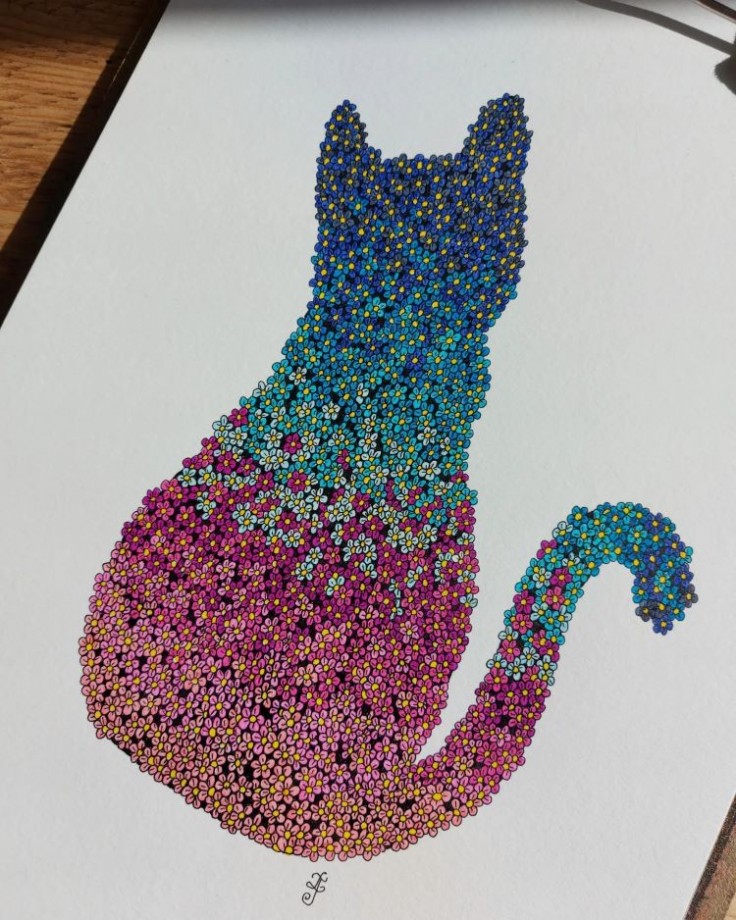 (Anna)さんが、花やキノコの絵で埋め尽くしてシルエットを描くイラスト作品です。小さな花やキノコなどのパターンで埋め尽くして、猫や月、ハートのシルエットを描いてます。