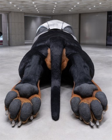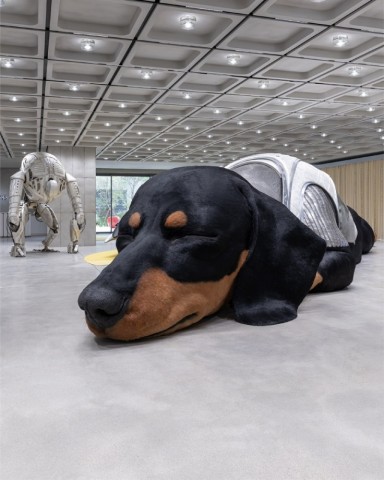 ソウルの未来的な店舗の床で昼寝をする巨大なダックスフントのインスタレーション