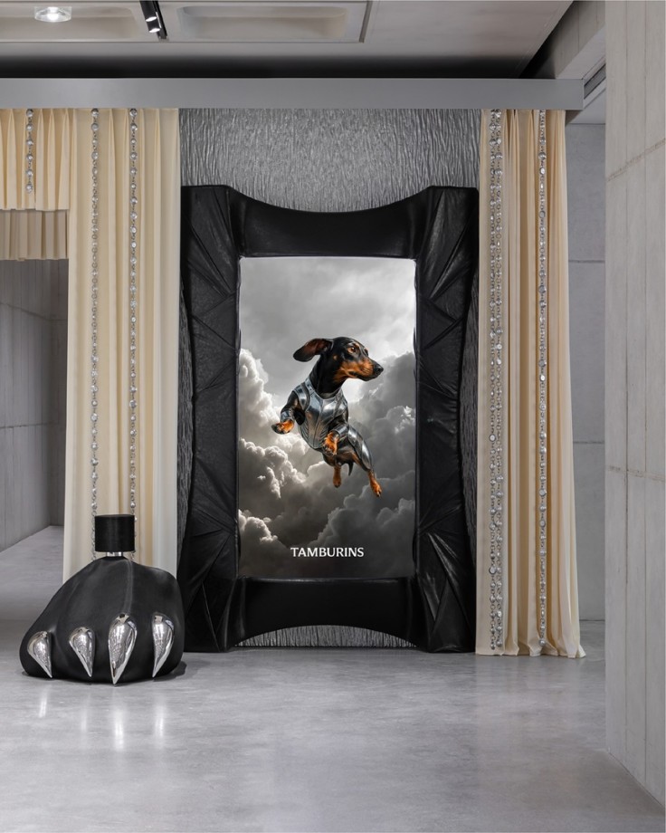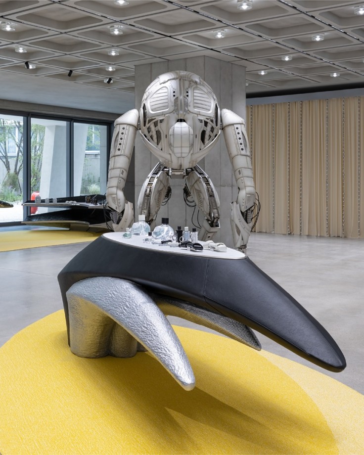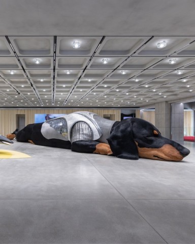 韓国発祥のアイウェアブランド Gentle Monster のソウルの新しい本社兼旗艦店 Haus Nowhere Seoul に展示されている巨大なダックスフントのインスタレーションです。「The Future Returned」と題されたこのインスタレーションは、午後の光の中で居眠りする犬のイメージからインスピレーションを得た、Tamburins の新しいフレグランス Sunshine を記念したものです。