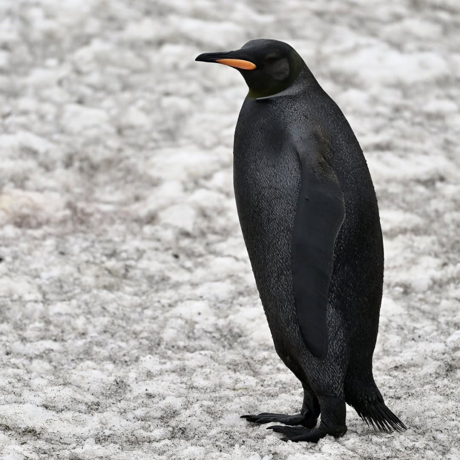 さんが、南極近くのサウスジョージア島で発見した、珍しい全身が黒いペンギンです。先天的に黒い色素の元であるメラニンが通常よりも過剰に生成される「メラニズム」により、「黒変種」となったオウサマペンギンで、ペンギンで黒変種になる例は非常に珍しいとされます。