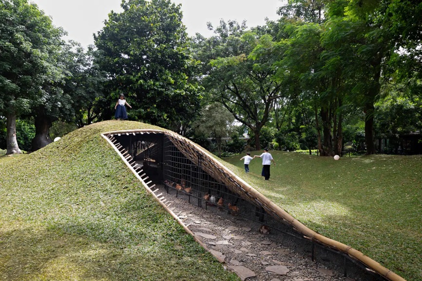 バリ島の建築事務所 RAD+ar が設計。再生竹で組まれた屋根の屋上を緑化し、緑の丘のようにして、風景に溶け込むデザインとしています。鶏舎は敷地内にある6軒のレストランの食品廃棄物処理場(堆肥化された食品廃棄物や乾燥した葉を鶏の寝床などに利用)として機能すると共に、卵をレストランと鶏舎訪問者に配布しています。