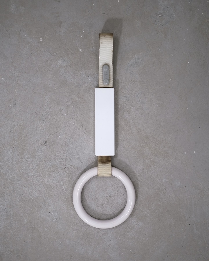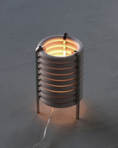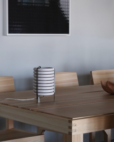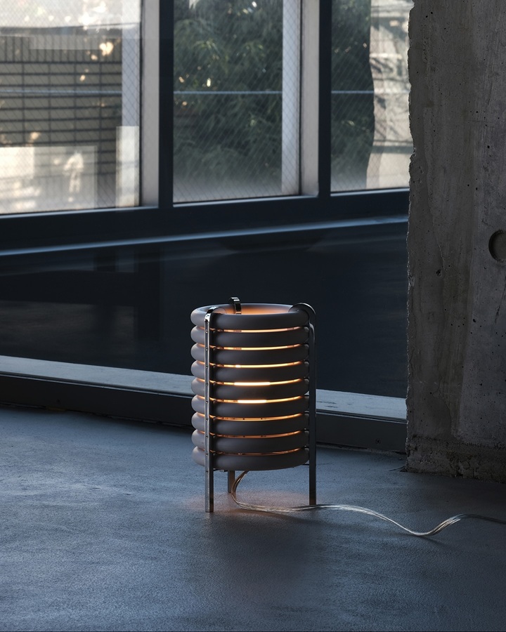 が、東京の古い電車の部品で作ったテーブルランプです。引退した東急田園都市線8500系から回収されたつり革のプラスチックのリングを積み重ねて、スタイリッシュなテーブルランプとして蘇らせています。