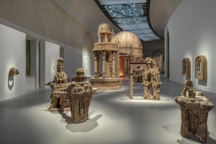 さんが、ローマの古代遺跡にインスピレーションを得て、段ボールで制作した彫刻作品です。段ボールという身近で形を変えられる素材で、古代ローマ遺跡を模した壮大な没入型インスタレーションを作っています。パリのグラン・パレで、個展が開催されています。